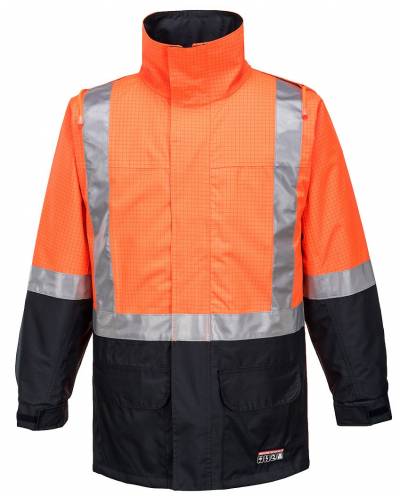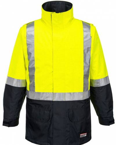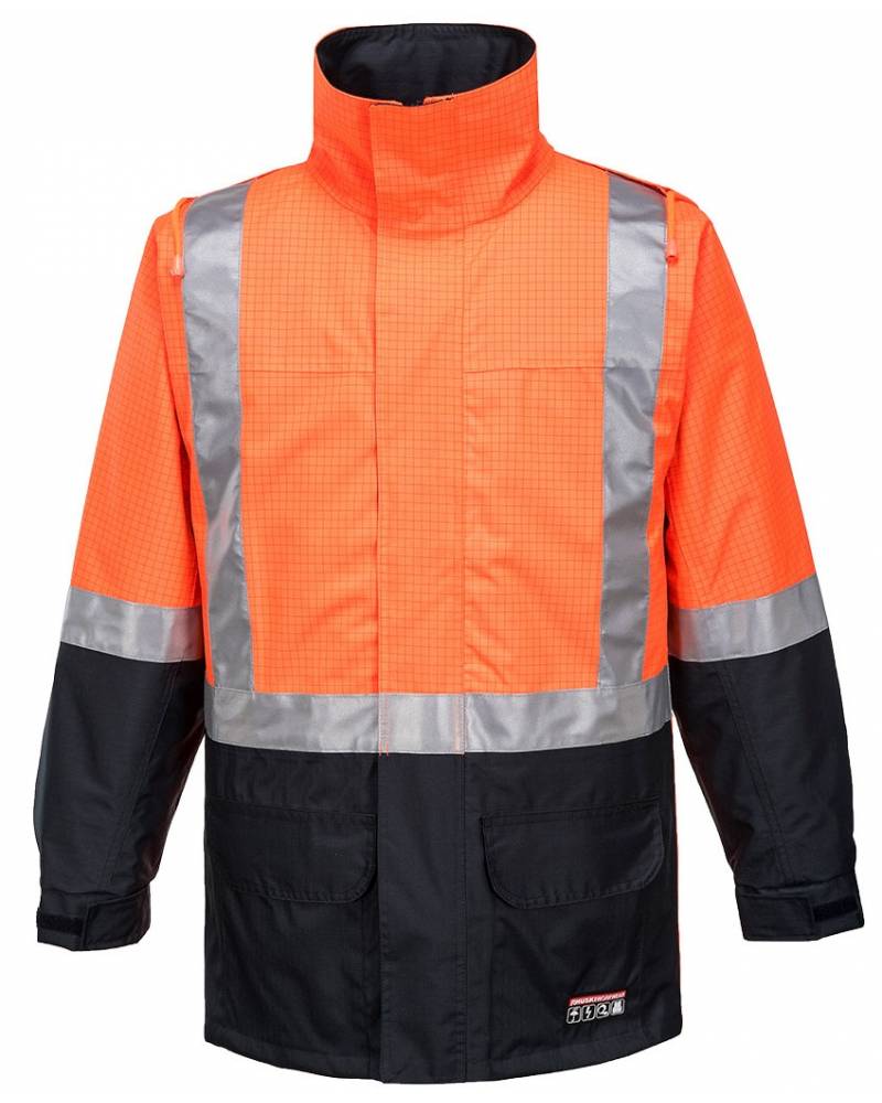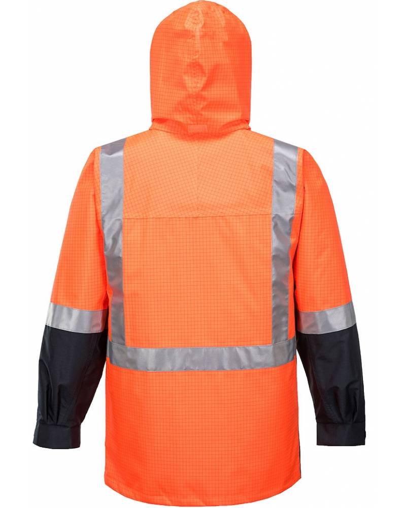 High visibility anti-static breathable long line jacket with concealed hood and storm front. Features waterproof/breathable BREATHETEC™ coating, 100% cotton lining, anti-static premium reflective tape, no metal parts. UPF 50+
